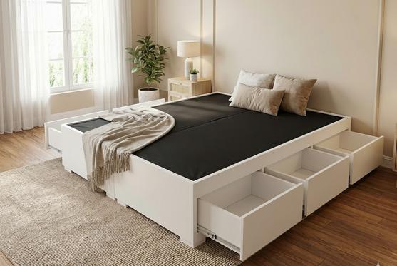 Base Modelo Sienna Con 6 Cajones Tamaño matrimonial disponibles en color blanco, gris y chocolate, tendido corrido, resistente y durable, incluye tafeta sobre el tendido para proteger su colchon, con correderas de extension, medidas: Alto 36 cms, Fondo 196 cms, Ancho 139 cms, $7290